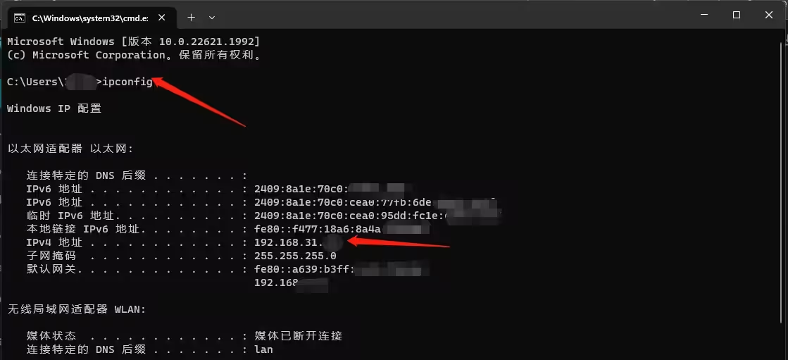2.cmd中使用ipconfig查看自己电脑局域网的ip。