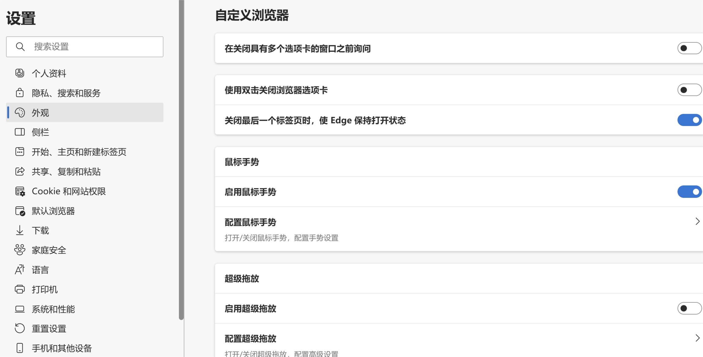 edge鼠标手势拖曳插件 2024年04月15日 路仔 编辑 我一直喜欢 smartUp手势插件 ,但最近拖曳后会打开两个搜索引擎。 查了一下,原来edge在“设置” -- “外观” -- “自定义浏览器”中内置了“超级拖放”, 目前内置的功能比较弱,关闭即可。两个功能类似的插件凑在一起了。 春游 购买2.5G网卡群晖网口聚合?